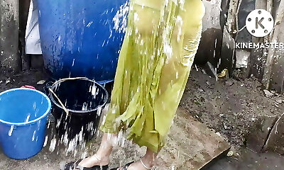 Scorching indian house wife bathing outside and washing clothes